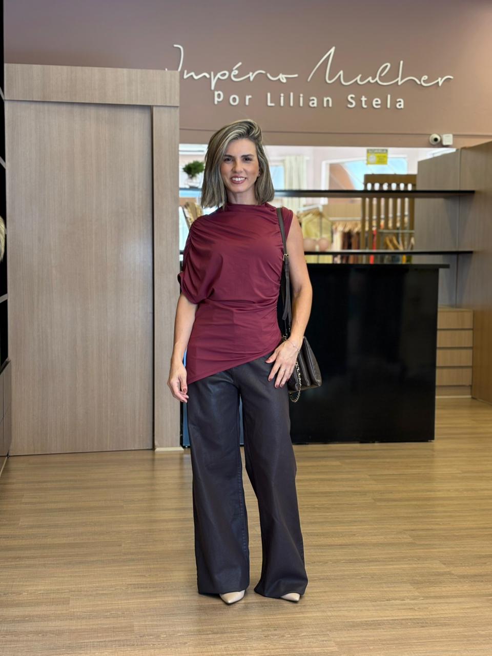 Blusa feminina na cor marsala, com design moderno e sofisticado. Possui modelagem assimétrica com drapeado lateral que valoriza a silhueta e traz um toque elegante ao look. A manga diferenciada com detalhe franzido adiciona charme e estilo à peça, tornando-a perfeita para composições que vão do casual chic ao mais sofisticado.