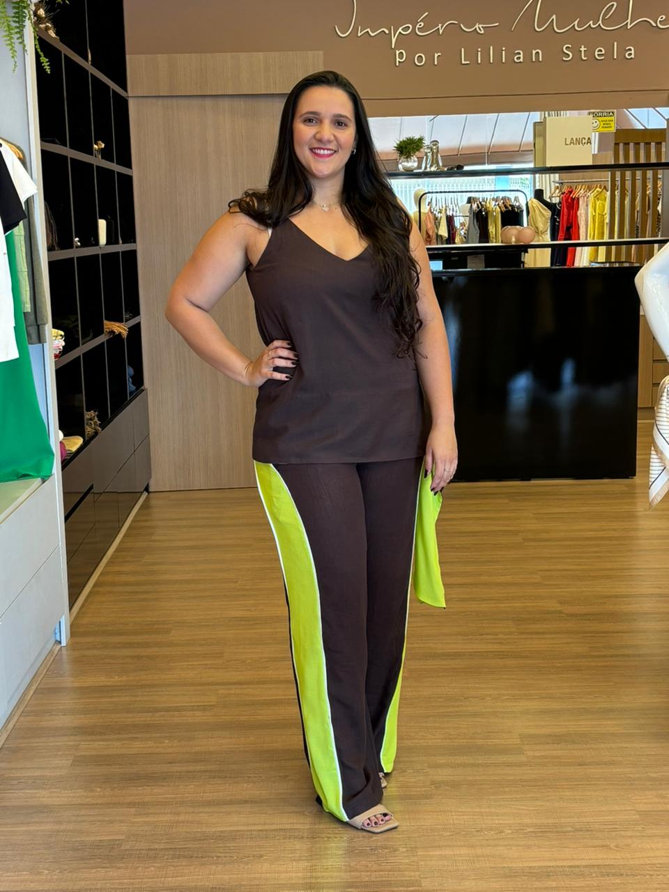 O decote V valoriza o colo e alonga a silhueta, enquanto o recorte lateral contrastante em tom verde traz um diferencial moderno e sofisticado à peça. Sua barra assimétrica adiciona movimento e estilo, deixando o visual ainda mais atual.