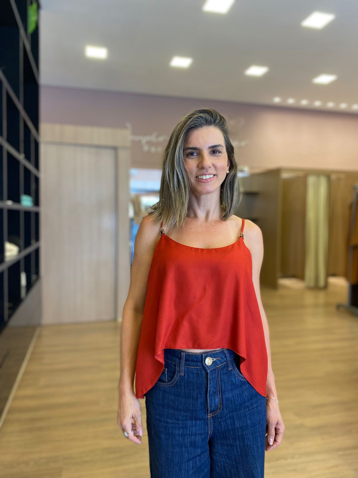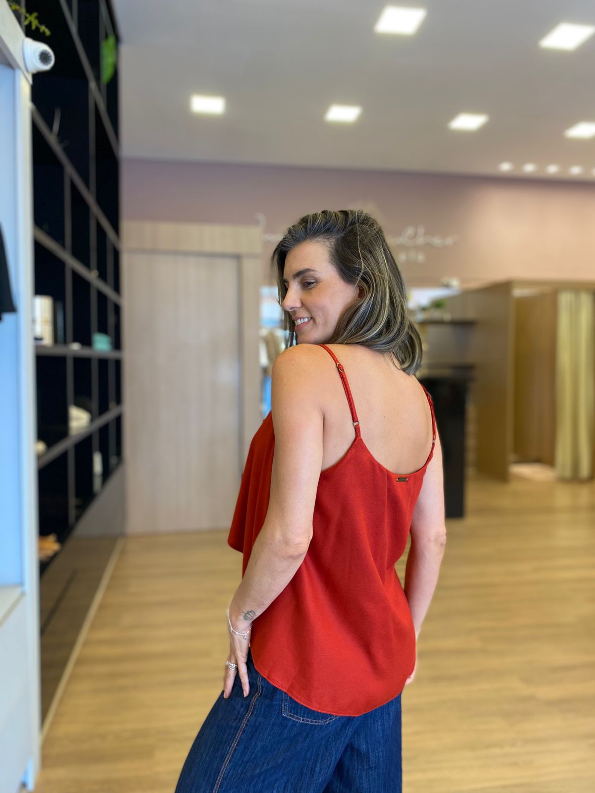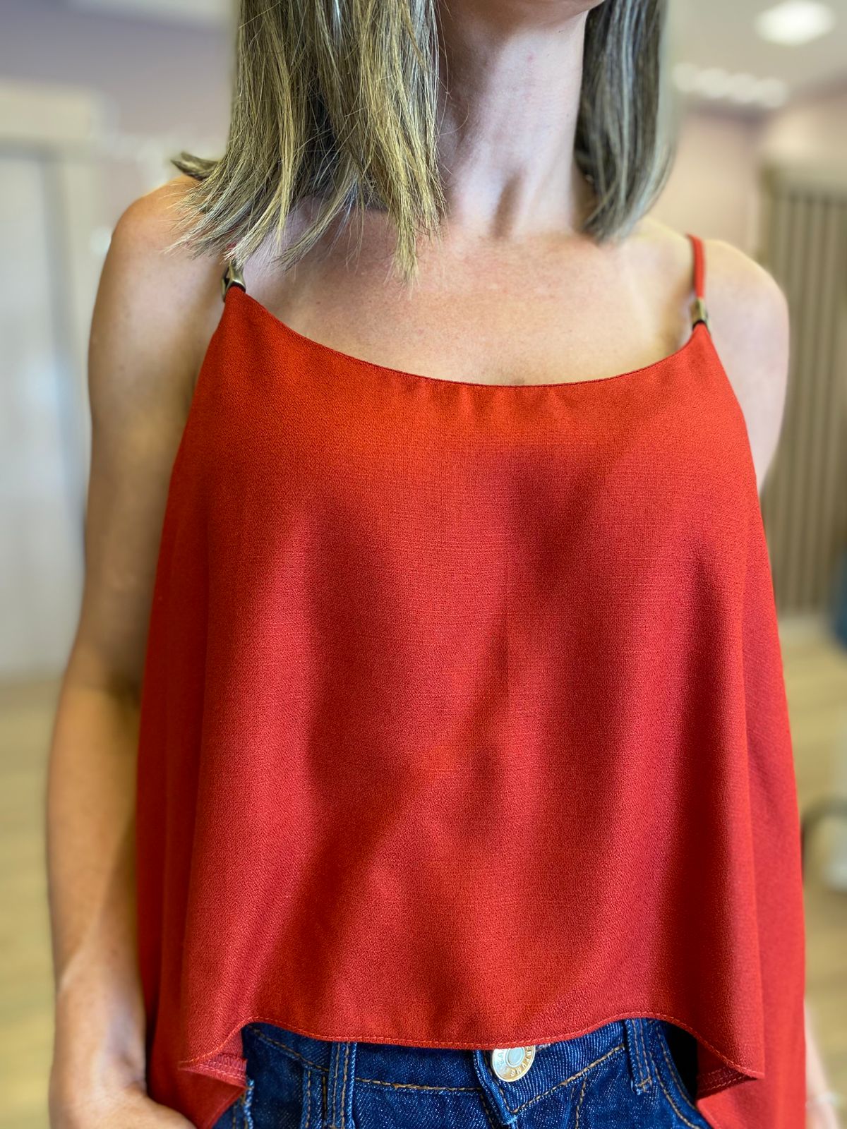 Blusa de alças finas, com caimento leve e modelagem solta que proporciona conforto e elegância no dia a dia. Confeccionada em tecido macio e fluido, possui decote delicado e comprimento levemente mais curto na frente, valorizando a silhueta sem marcar.