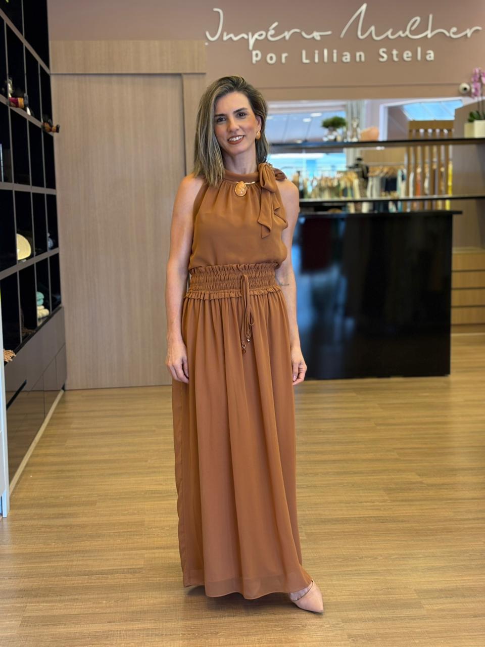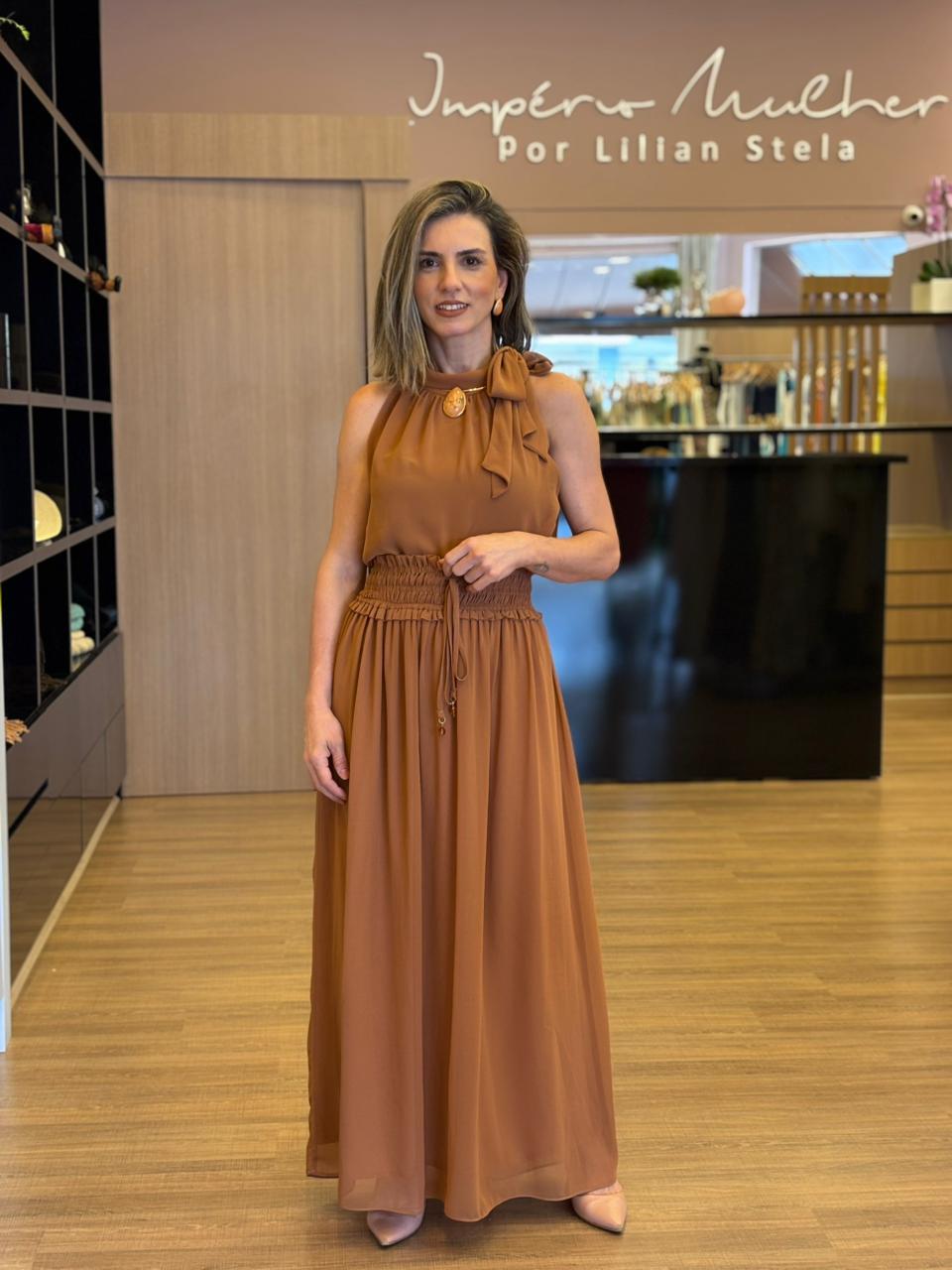 Conjunto elegante composto por blusa sem mangas com detalhe de laço no ombro e saia longa de caimento fluido. A saia possui cintura com elástico e forro, garantindo conforto e melhor acabamento. Ideal para ocasiões especiais, eventos e produções sofisticadas.