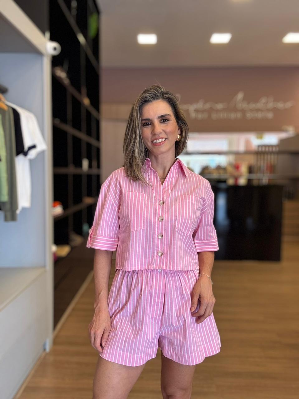 O short listrado rosa feminino de cintura alta é a peça ideal para quem busca conforto com elegância no dia a dia. Possui modelagem soltinha, cós com ajuste confortável e caimento leve que valoriza a silhueta sem marcar.