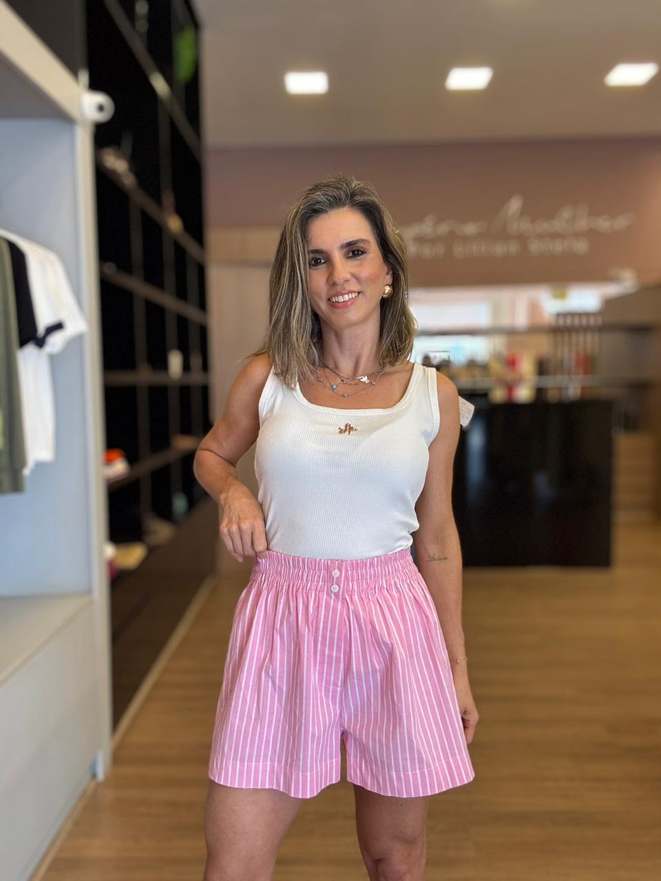 Versátil e moderno, o short listrado rosa feminino de cintura alta combina perfeitamente com camisas, regatas e blusas delicadas, criando produções casuais chic para diversas ocasiões.