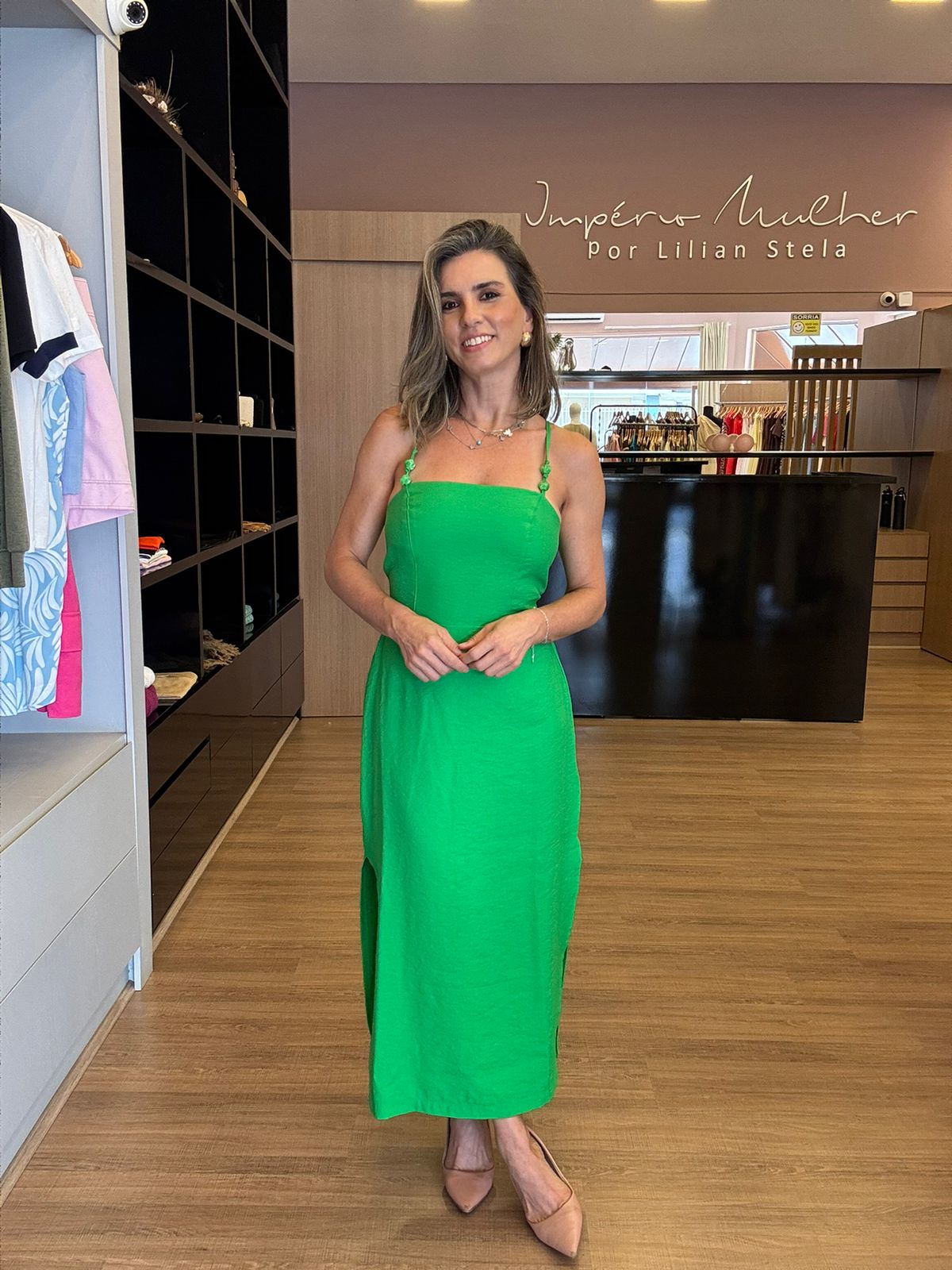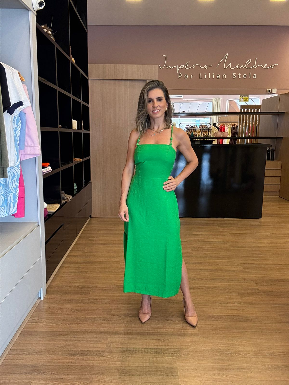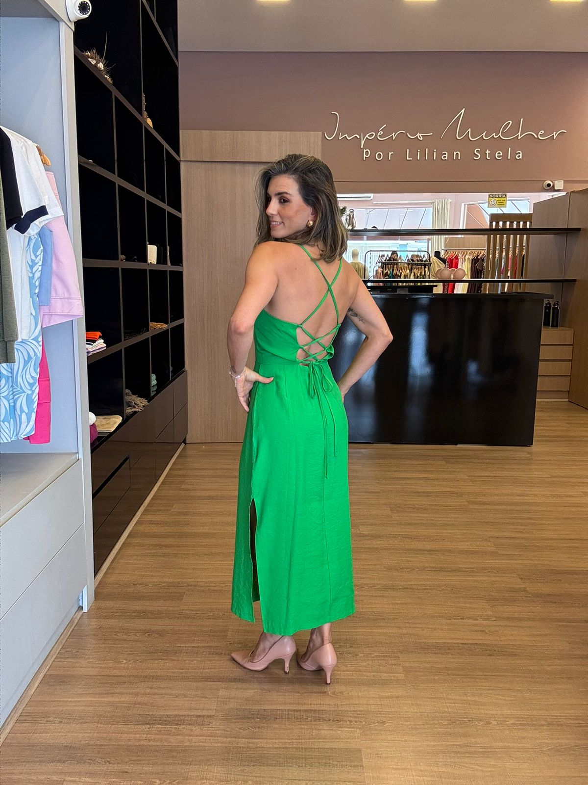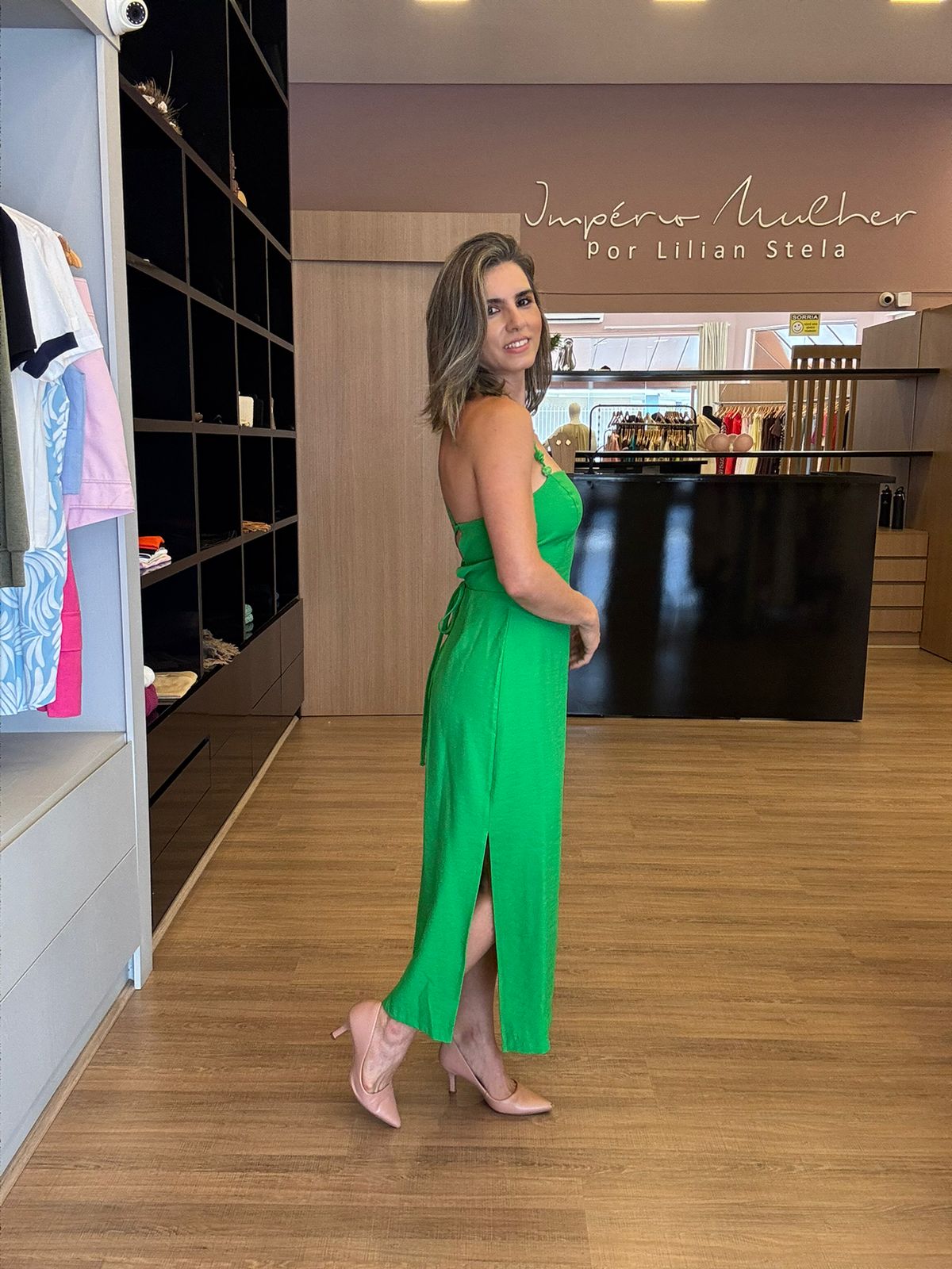 O vestido midi elegante verde é a escolha ideal para quem busca sofisticação com leveza. Possui modelagem fluida, alças delicadas com detalhe e costas com amarração, valorizando a silhueta sem marcar. A fenda lateral traz movimento e feminilidade, enquanto o tecido leve garante conforto durante todo o dia.