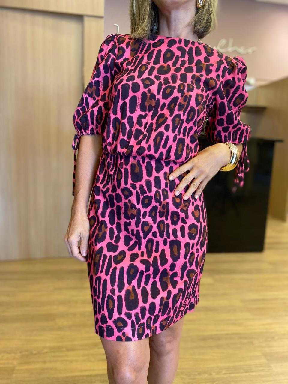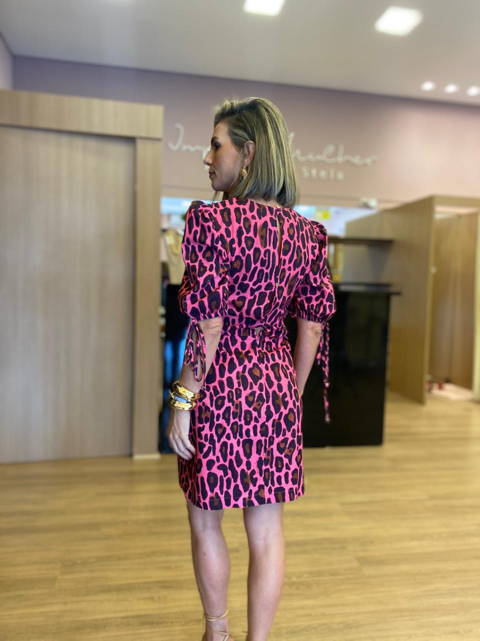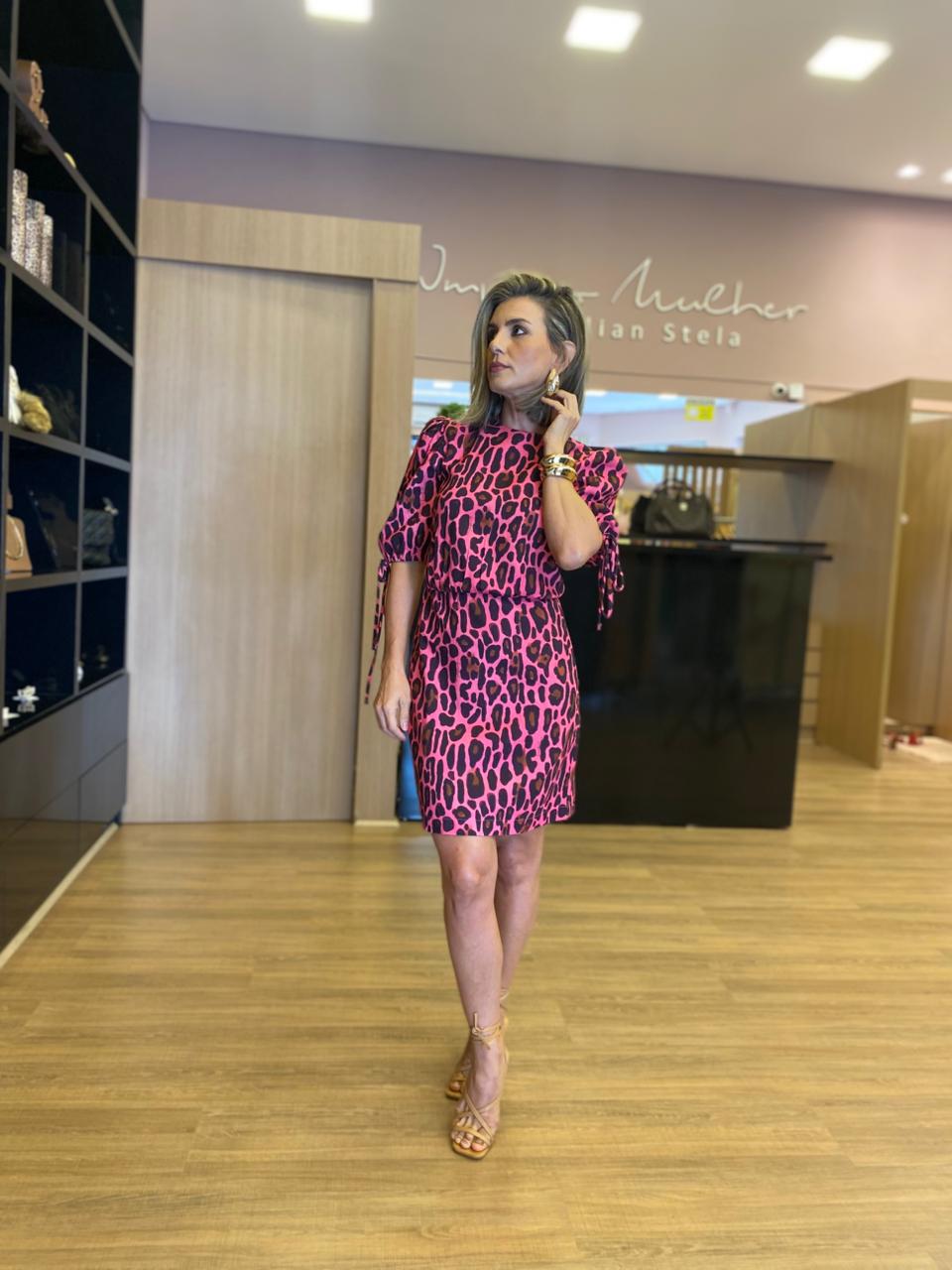 Vestido curto feminino com estampa animal print em tom rosa vibrante, perfeito para quem ama looks modernos e cheios de personalidade. A peça possui modelagem que valoriza o corpo, com cintura levemente marcada e caimento impecável.