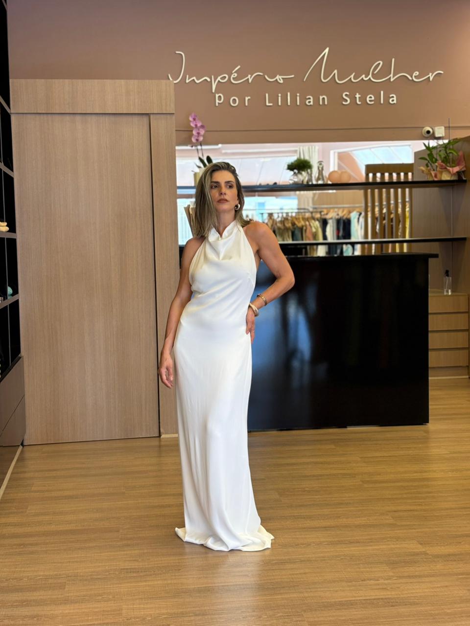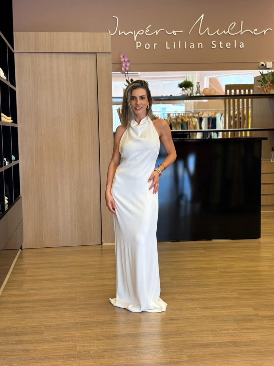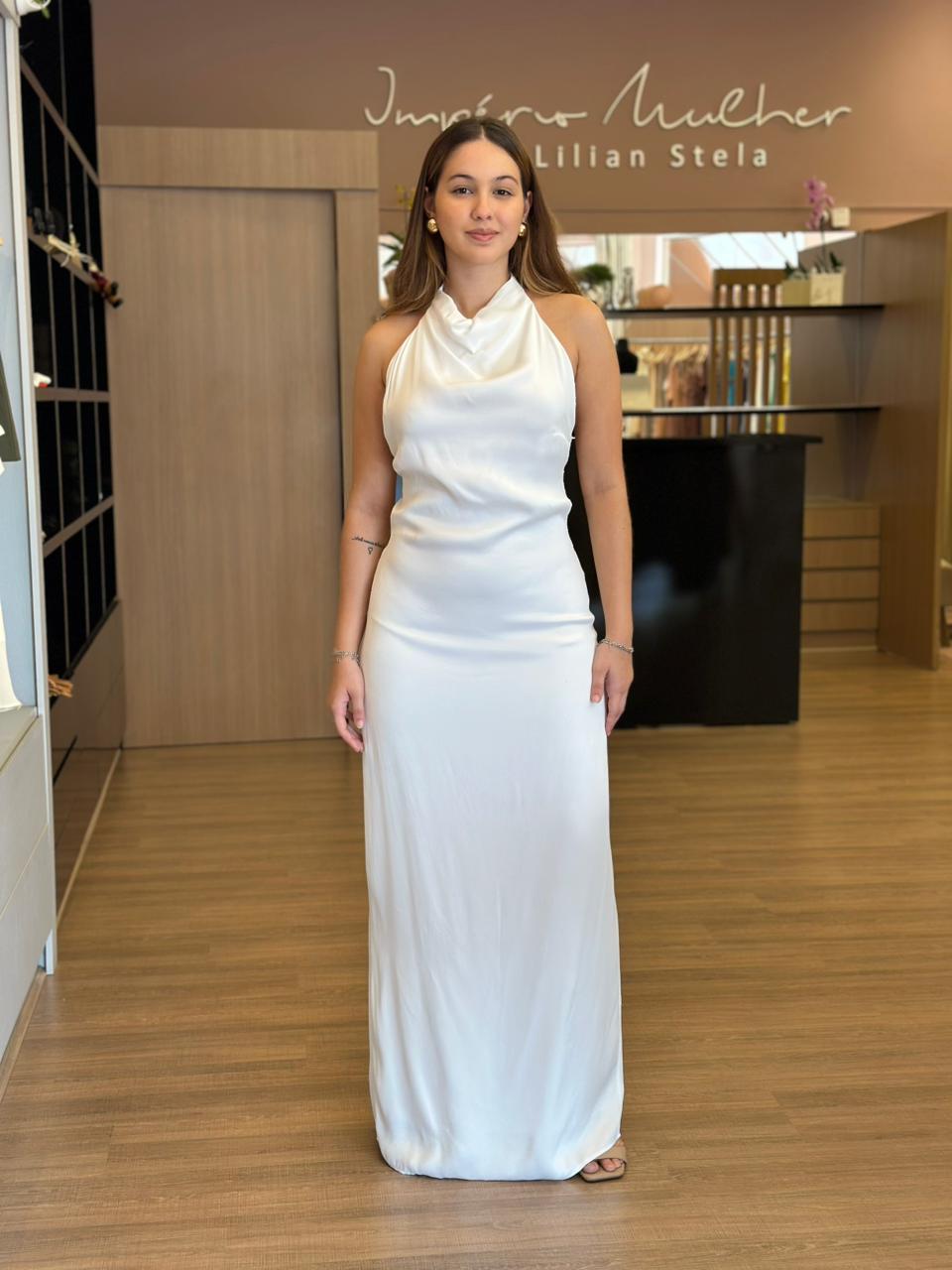 Vestido longo de modelagem elegante e feminina, com frente única e caimento leve que valoriza a silhueta. O destaque fica por conta das costas totalmente abertas, com amarração delicada que garante ajuste perfeito e um visual sofisticado. O tecido fluido proporciona conforto e movimento, tornando a peça ideal para eventos especiais, festas, jantares ou ocasiões que pedem um look refinado e atemporal. Um vestido versátil, elegante e marcante.