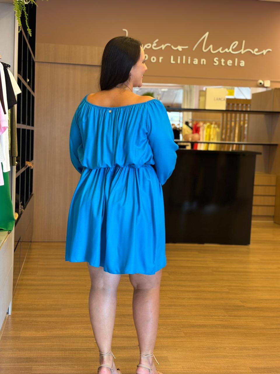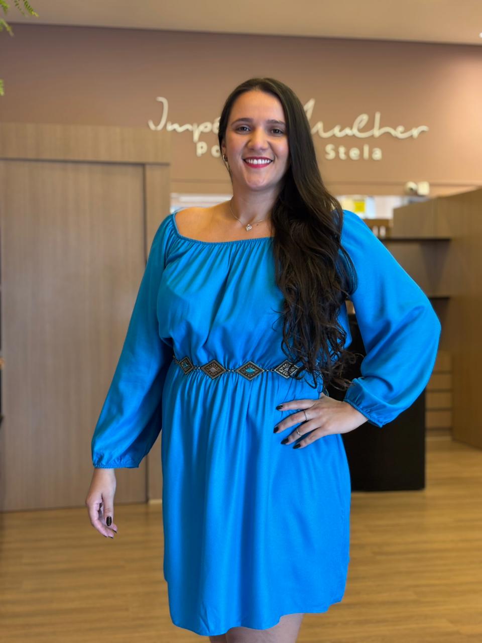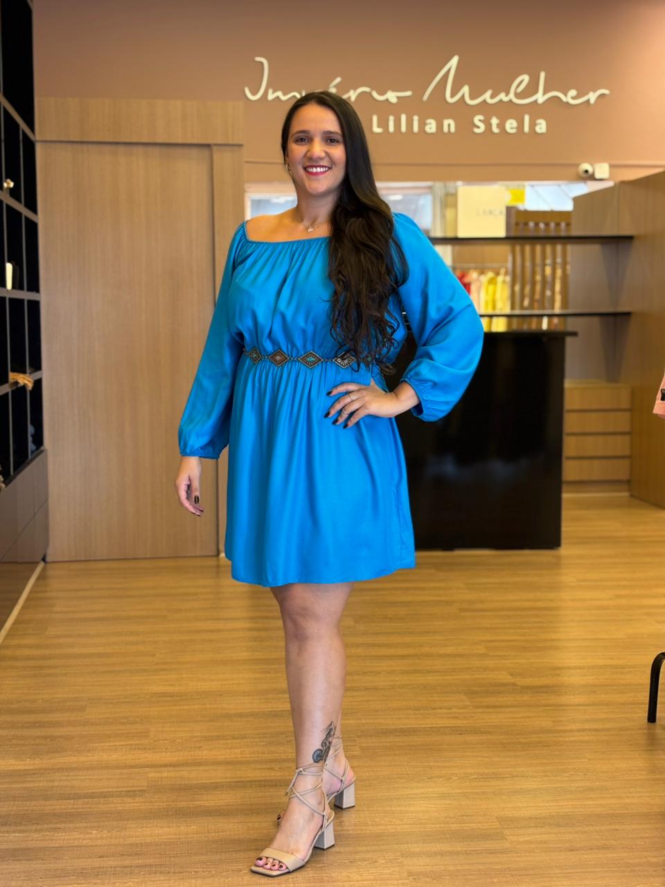 O vestido azul traz feminilidade e movimento em uma peça confortável e sofisticada. Possui mangas longas com leve volume, elástico na cintura que valoriza a silhueta e caimento fluido que não marca.