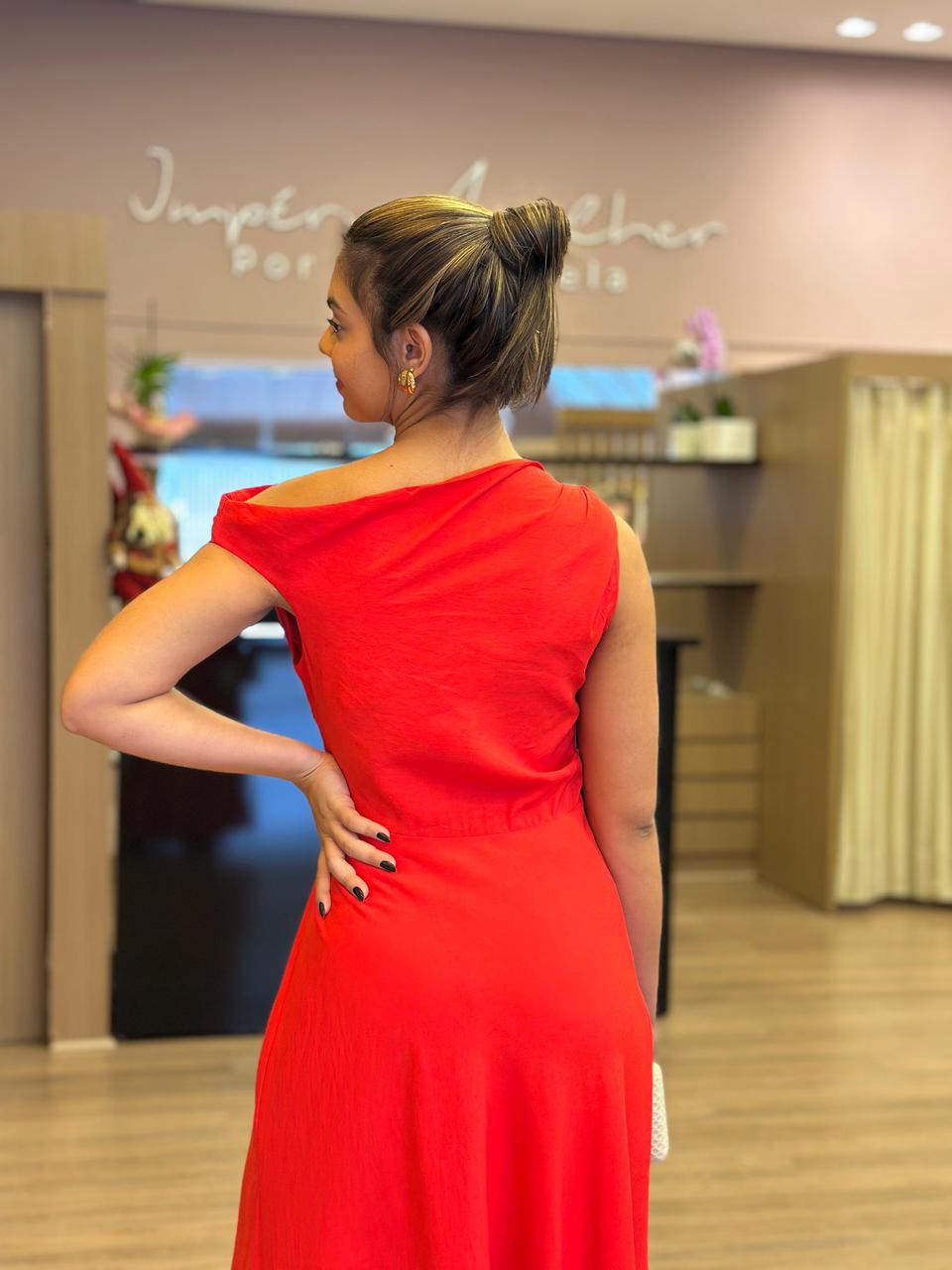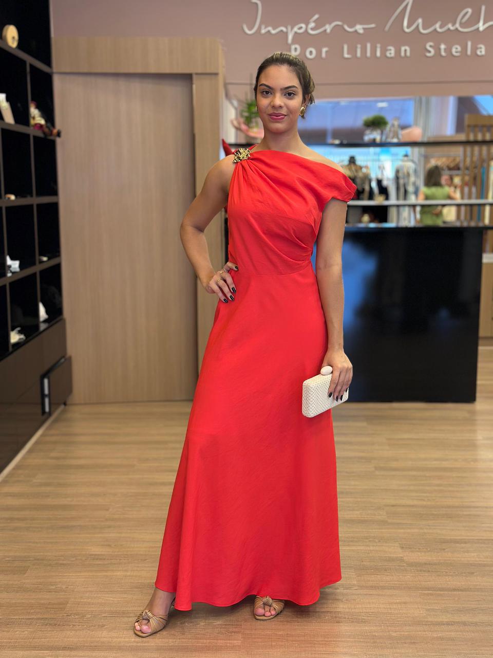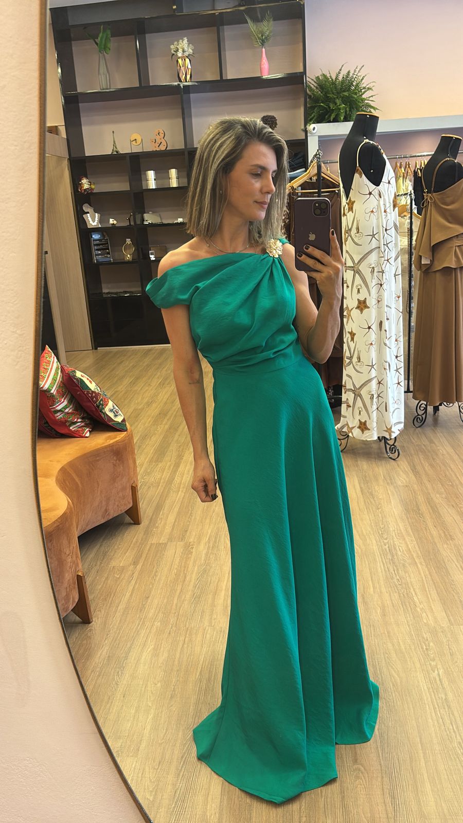 Vestido longo confeccionado em tecido leve e fluido, com modelagem elegante de um ombro só que destaca o colo de forma sofisticada. Possui detalhe de broche aplicado no ombro, agregando charme e requinte ao design. A saia longa com caimento suave proporciona movimento e conforto, tornando a peça ideal para eventos sociais, festas, casamentos e ocasiões que pedem presença marcante e feminina.