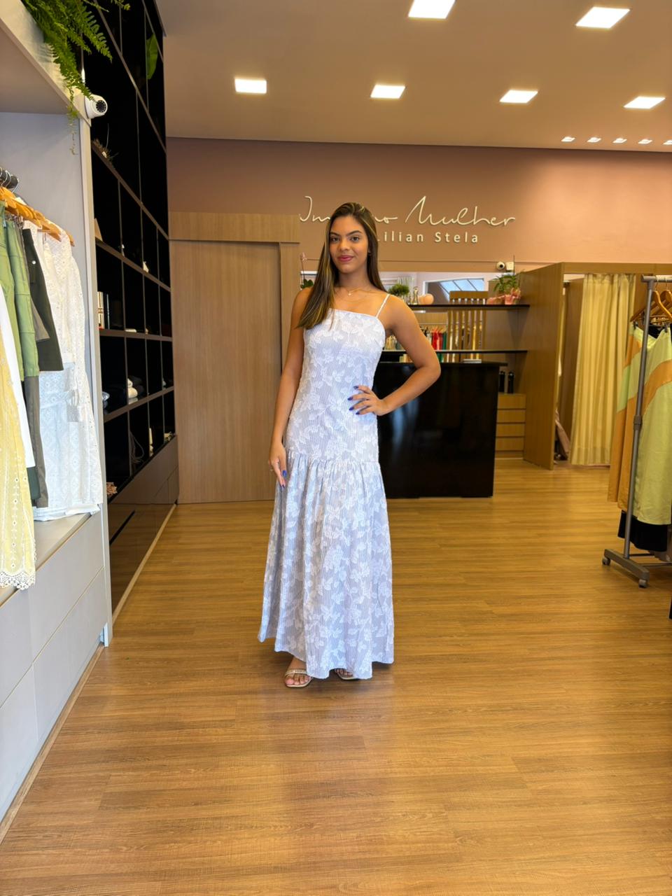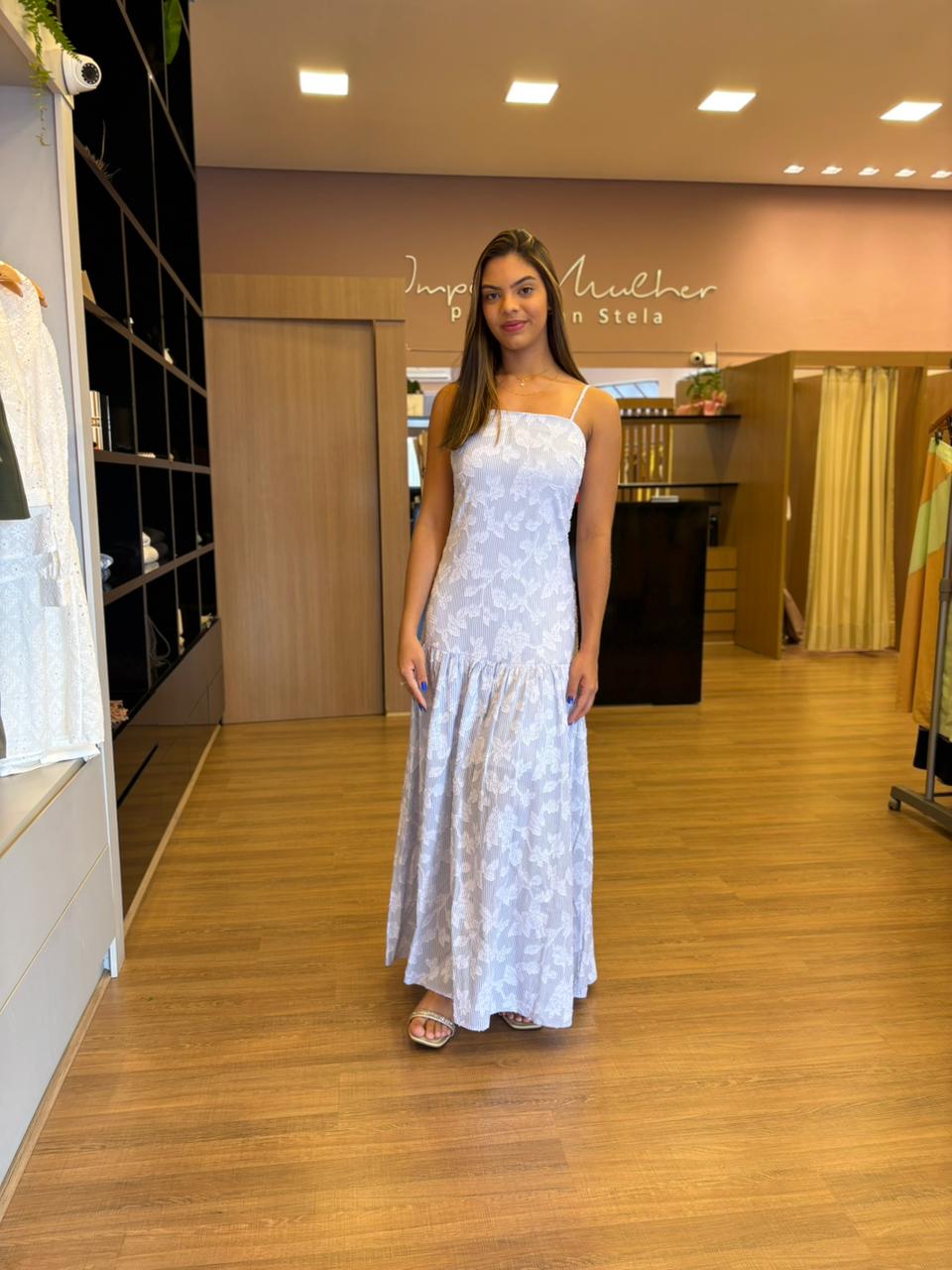 Possui alças finas, decote reto e modelagem ajustada na parte superior, valorizando a silhueta com conforto. A saia longa e fluida, com leve recorte, garante movimento e leveza ao caminhar.